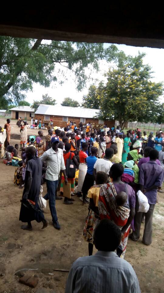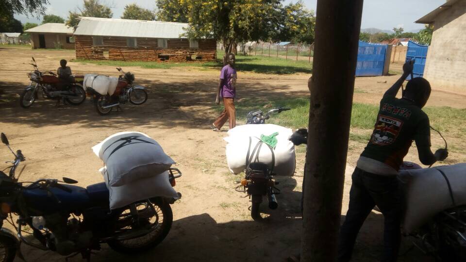 Arrival of 14 tons of maize flour in June 2017 in cooperation with Feed the Hungry transshipment of maize flour in Uganda Unloading the maize flour in Torit Distribution of the maize flour in Torit Maize flour distribution for Mothers Union Loading the maize four for Ofirika